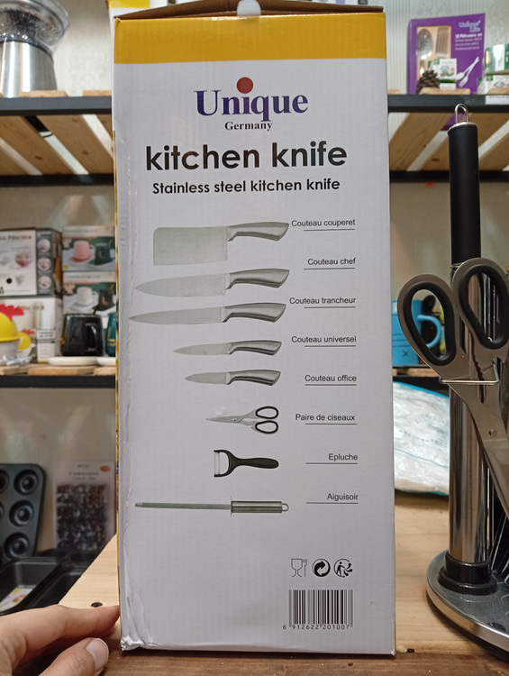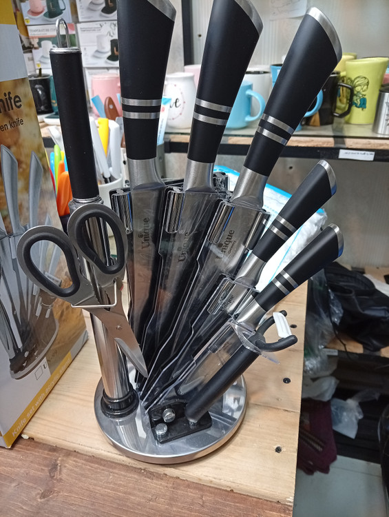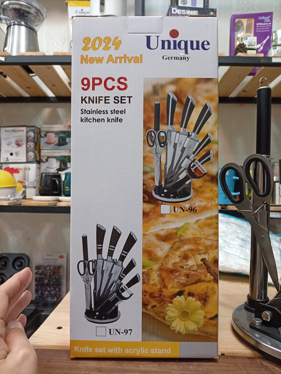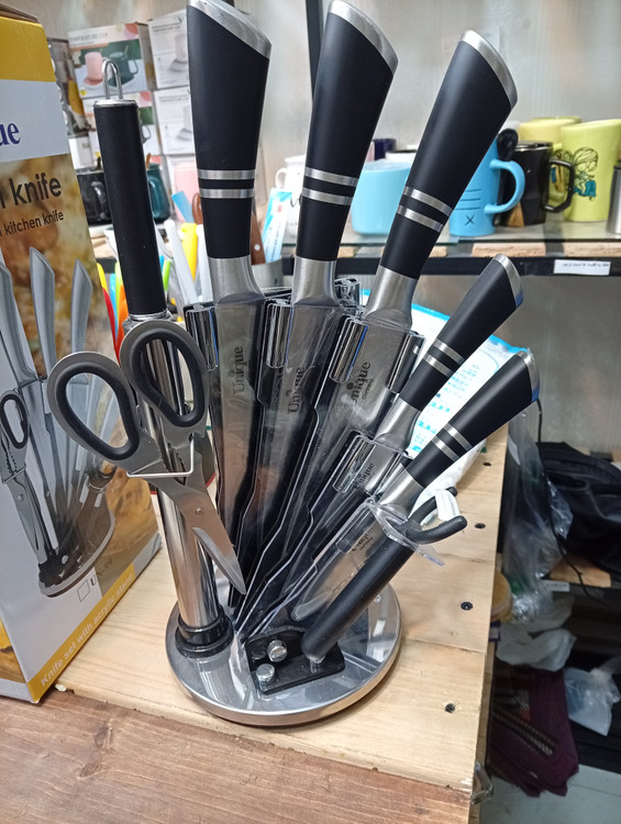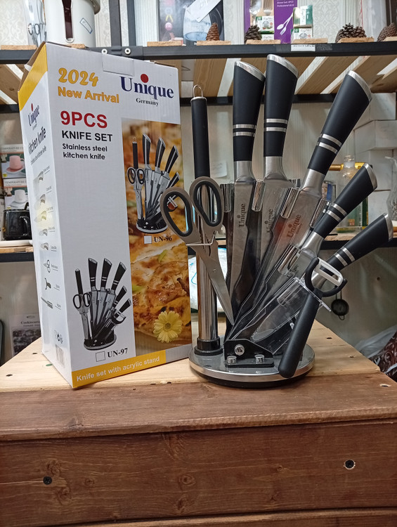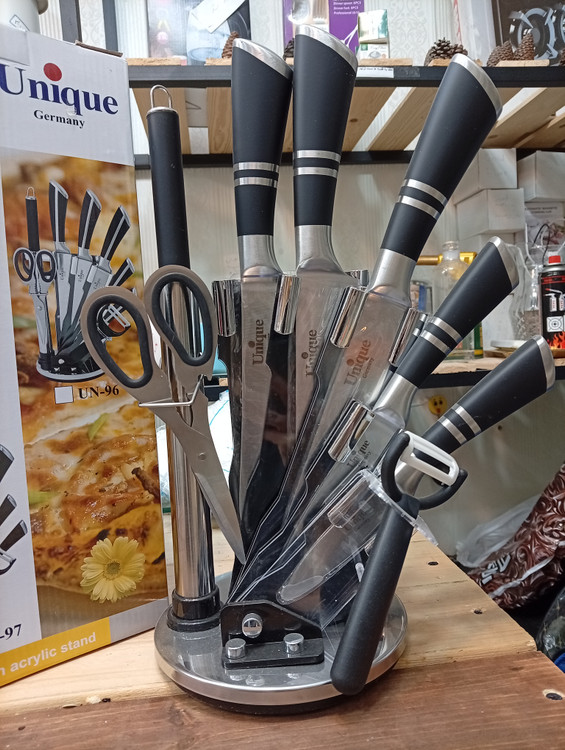 ساخته شده از استیل ضدزنگ شامل: یک پایه گردان یک قیچی یک ساطور یک چاقوی سرآشپز یک چاقوی برش نان یک چاقو به طول 24 سانتی متر یک چاقو به طول 20 سانتیمتر یک تیزکننده یک عدد پوست کن طراحی زیبا استحکام بالا بسیار برنده و تیز