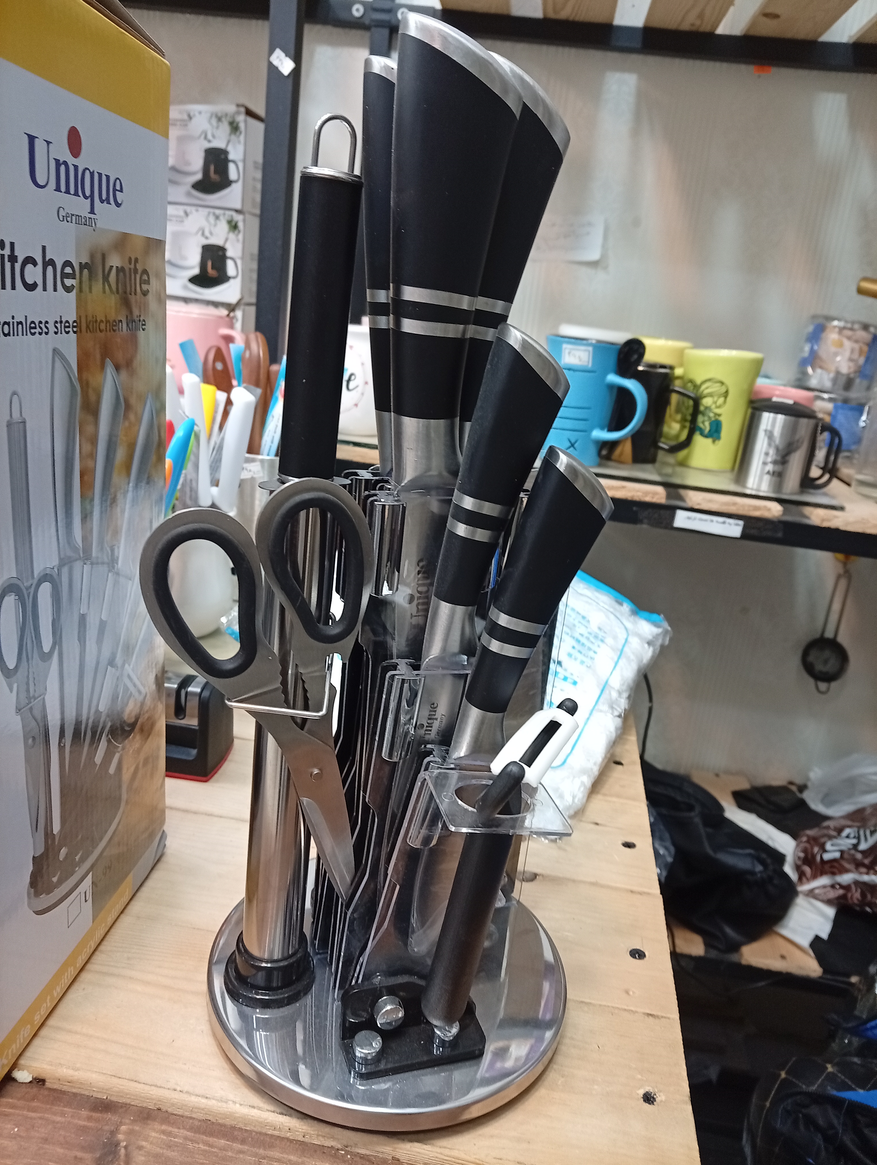 ساخته شده از استیل ضدزنگ شامل: یک پایه گردان یک قیچی یک ساطور یک چاقوی سرآشپز یک چاقوی برش نان یک چاقو به طول 24 سانتی متر یک چاقو به طول 20 سانتیمتر یک تیزکننده یک عدد پوست کن طراحی زیبا استحکام بالا بسیار برنده و تیز