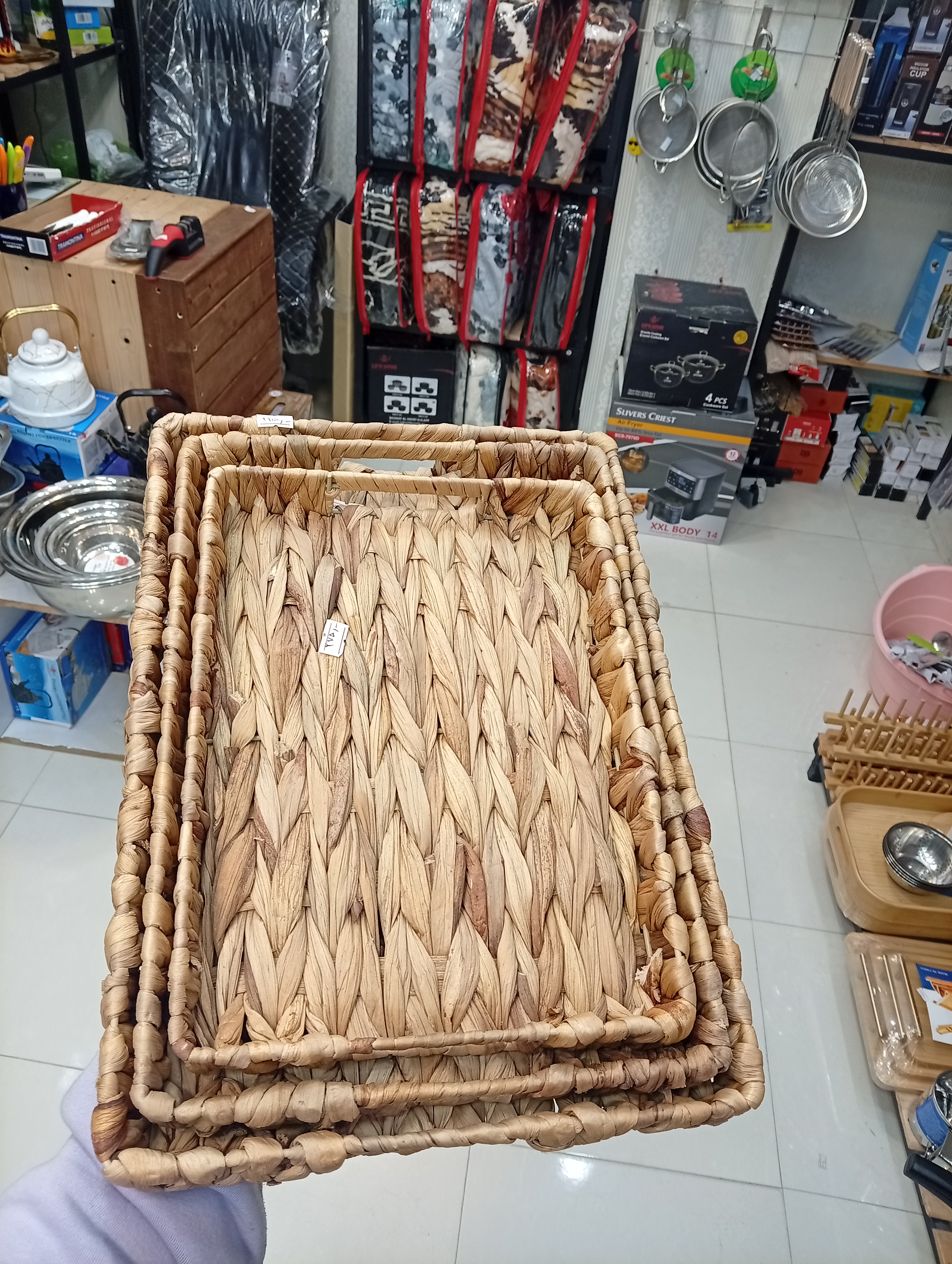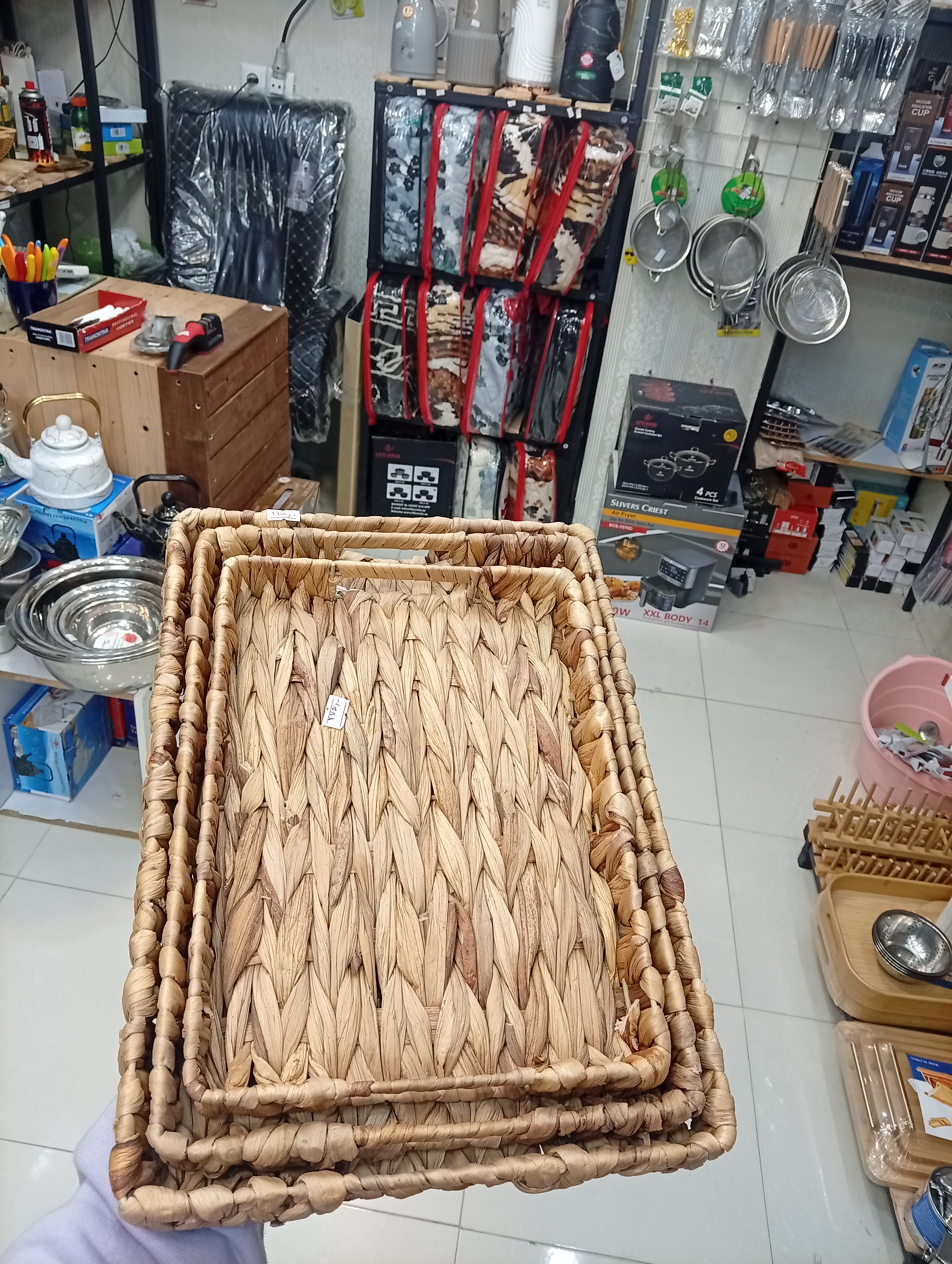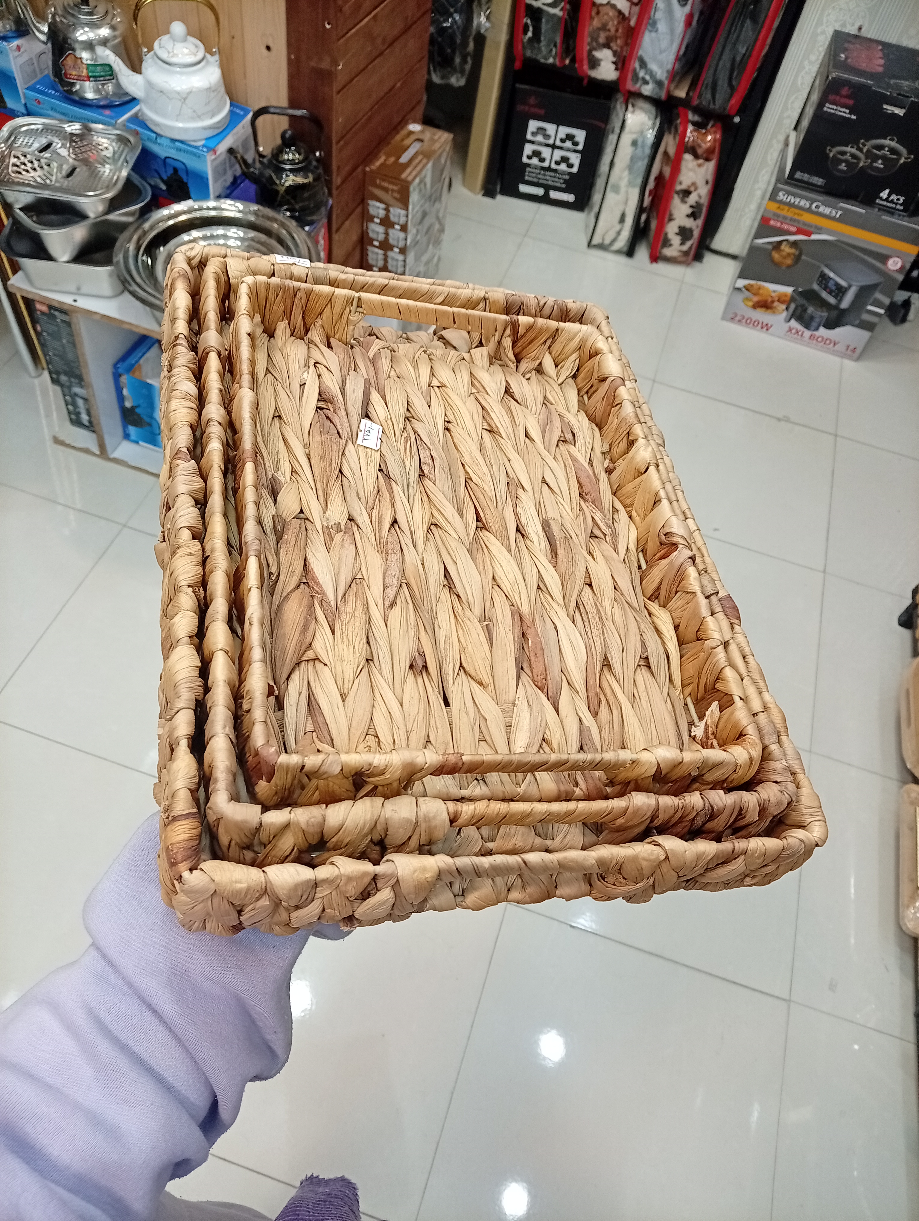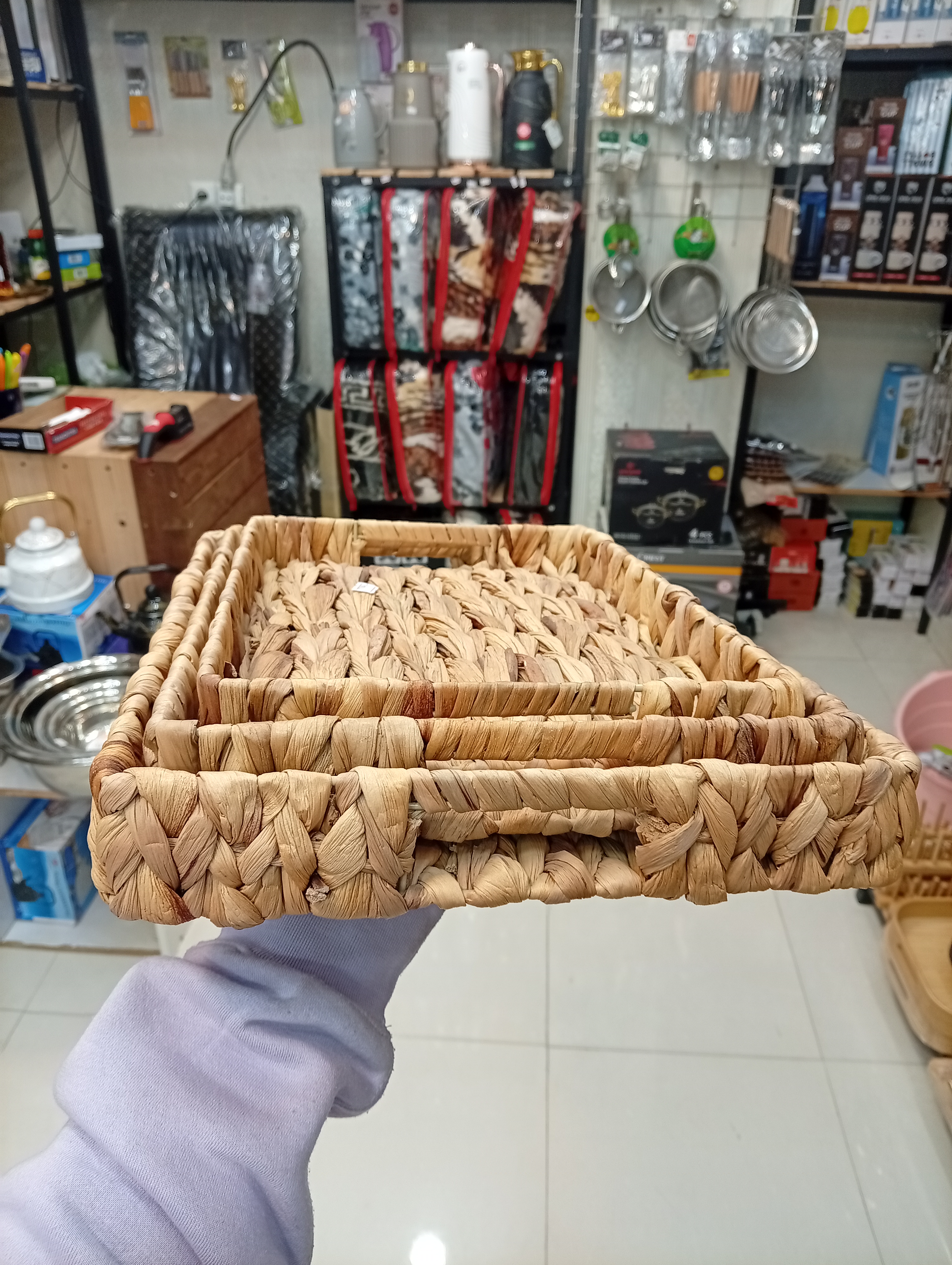 این ست شامل سه عدد سینی در سه سایز مختلف است که با ظرافت خاصی بافته شدهاند و همزمان حس طبیعت و سادگی را به خانه شما میآورند.