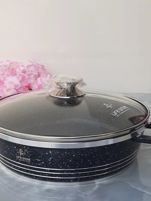 تابه دو دسته سرامیکی برند LIFE SMILE با جنس بدنه آلومینیوم و پوشش داخلی و خارجی سرامیکی. این تابه دارای درب شیشهای و دستگیره یکپارچه همرنگ بدنه است. قابلیت استفاده در مایکروویو و شستشو در ماشین ظرف شویی را دارد.